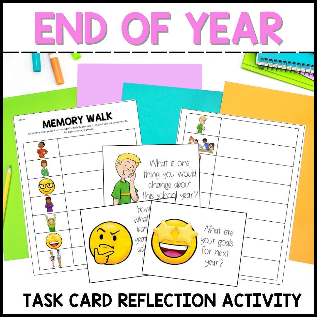 The end of the year can feel super hectic! It's time to add some ease to your day with these memory walk task cards. The perfect addition to your last week of school activities! Including 15 different questions that students will walk around and answer as they reflect on their year.