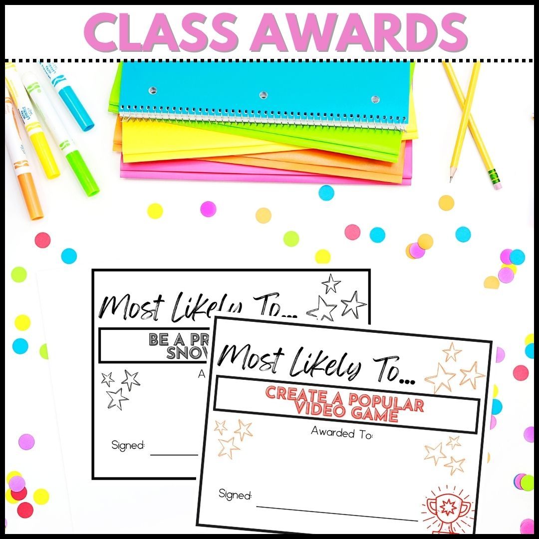 These class awards come with 50 editable superlative awards that are sure to bring a smile to your students' faces. These funny and engaging awards include categories such as "Most Likely to Become a Superhero and "Most Likely to Become a Youtube Star." Each award is editable, so you can easily add their name and yours.